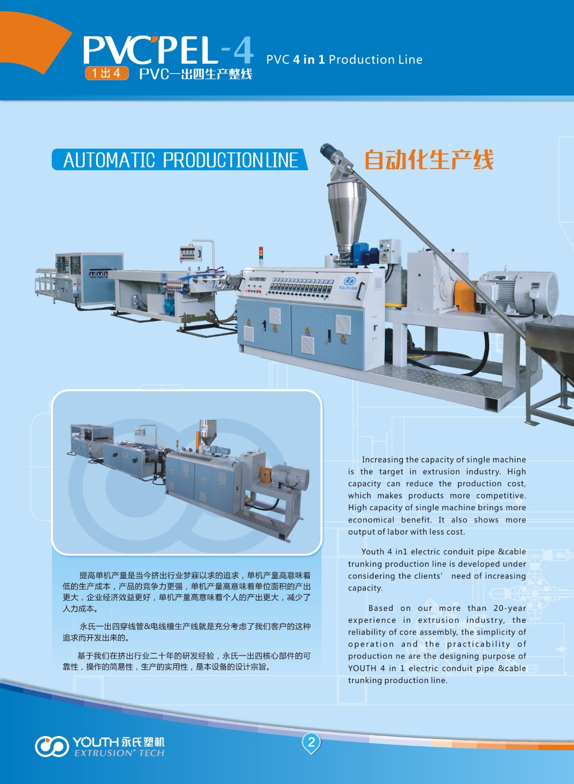 PVC一出四管材擠出生產(chǎn)線由65/132錐形雙螺桿擠出機,一出四模具,一出四真空定徑臺,牽引切割組合(無屑)和翻料架組成。最佳生產(chǎn)管材直徑的范圍為16-32mm。 主要特點:產(chǎn)量高,耗電量低,水氣耗損低,占地面積少,省人工,噪音低,粉塵少等。