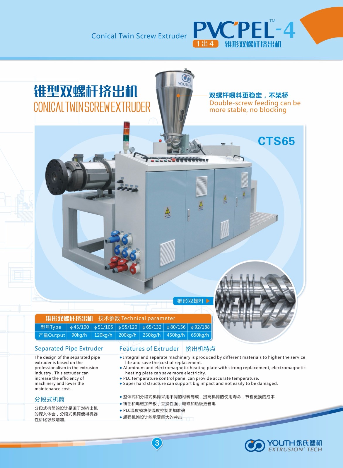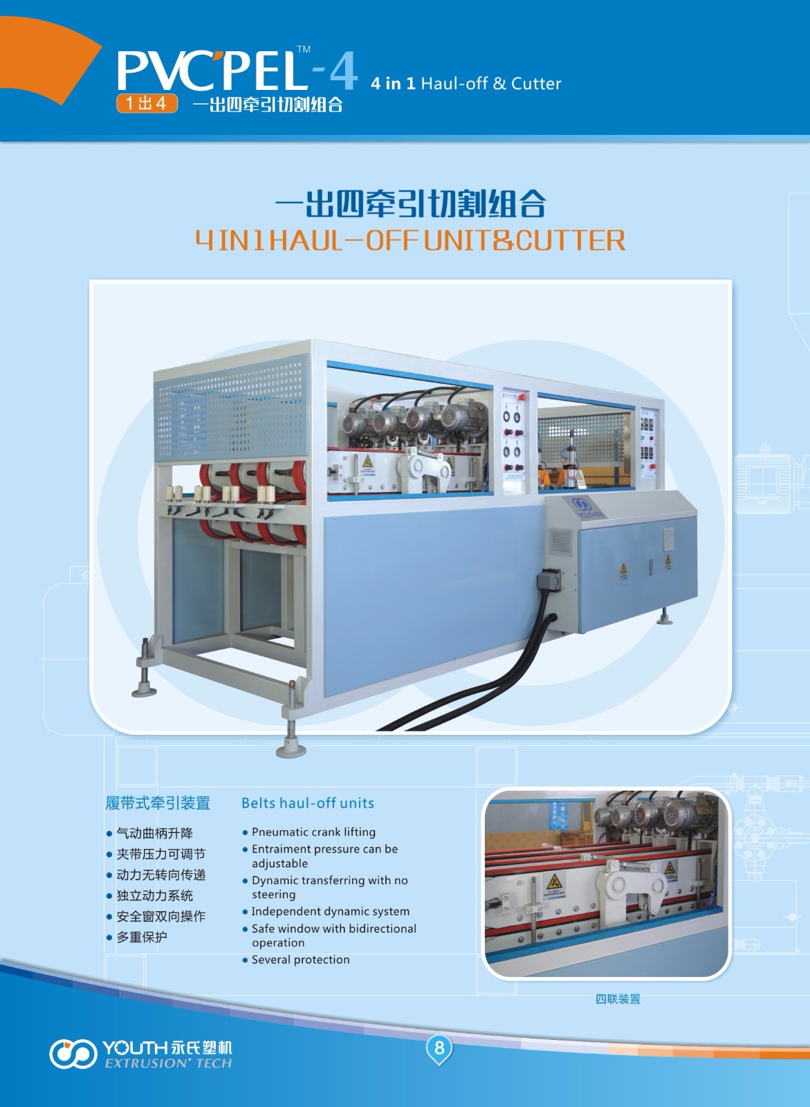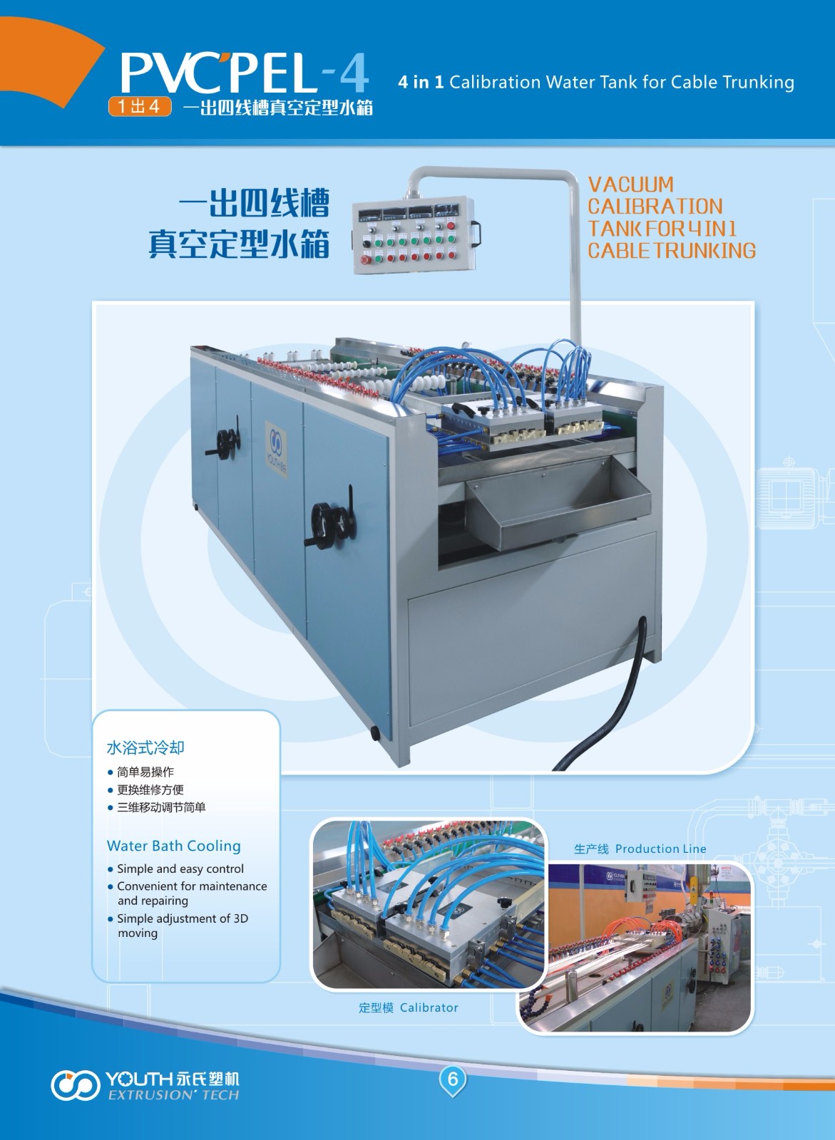 PVC一出四線槽擠出生產(chǎn)線由65/132錐形雙螺桿擠出機(jī),一出四線槽模具,一出四真空定型臺(tái),牽引切割組合(熱切無(wú)屑)和翻料架組成。最佳生產(chǎn)線槽大小的范圍為小于40*30mm。主要特點(diǎn):產(chǎn)量高,耗電量低,水氣耗損低,占地面積少,省人工,噪音低,粉塵少等。