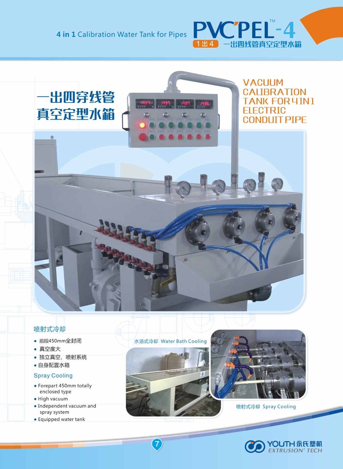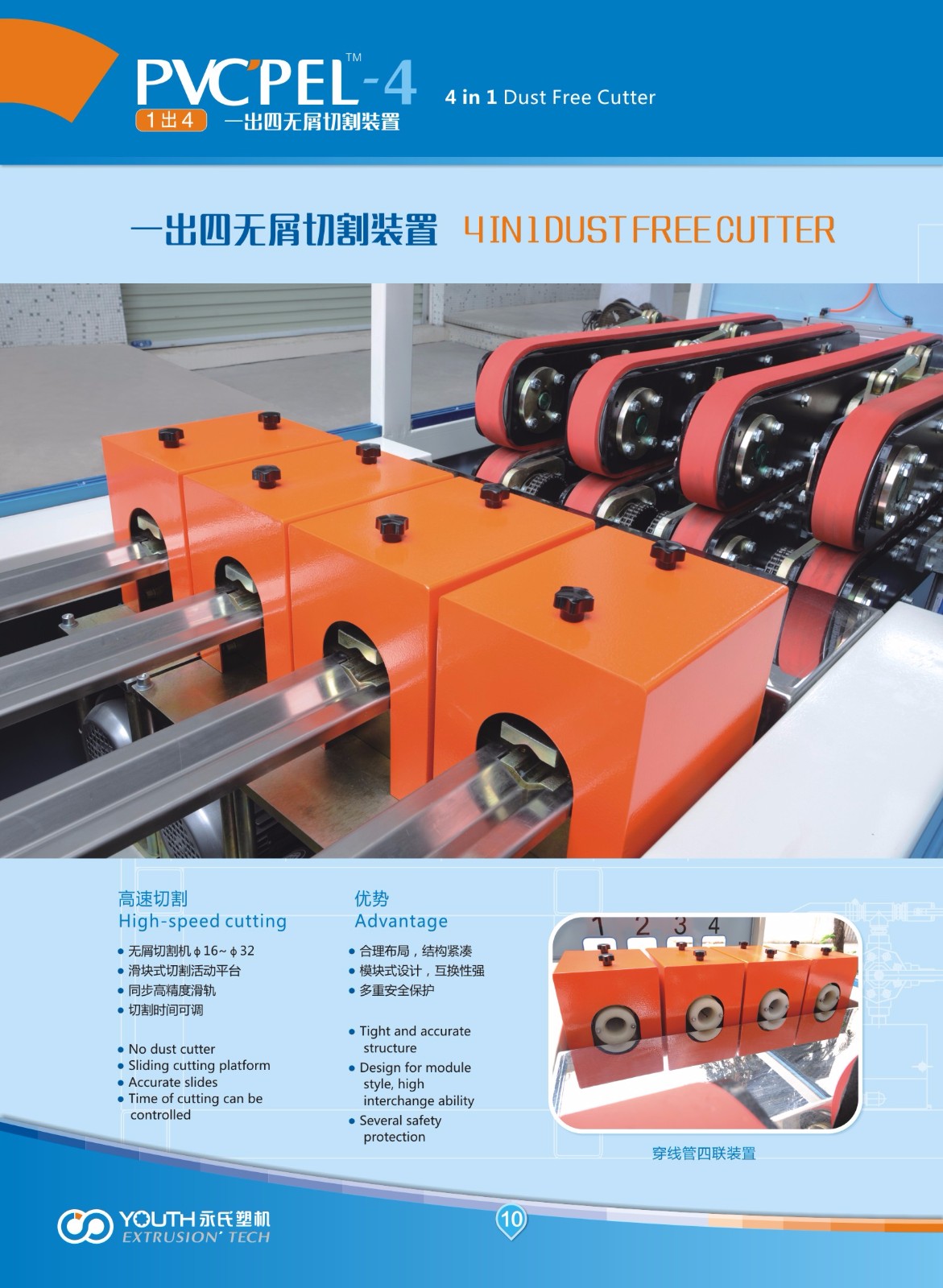 PVC four pipes (4 in 1) extrusion line is made of a 65/132 conical twin screw extruder, one set of 4 in 1 mould, one set of calibration table , haul-off & cutting combination (dust free) and stacker.The diameter of the best production tube is from16mm to 32mm.Main features: high capacity, low power consumption, low water gas consumption, low occupation, low noise, low dust, etc.