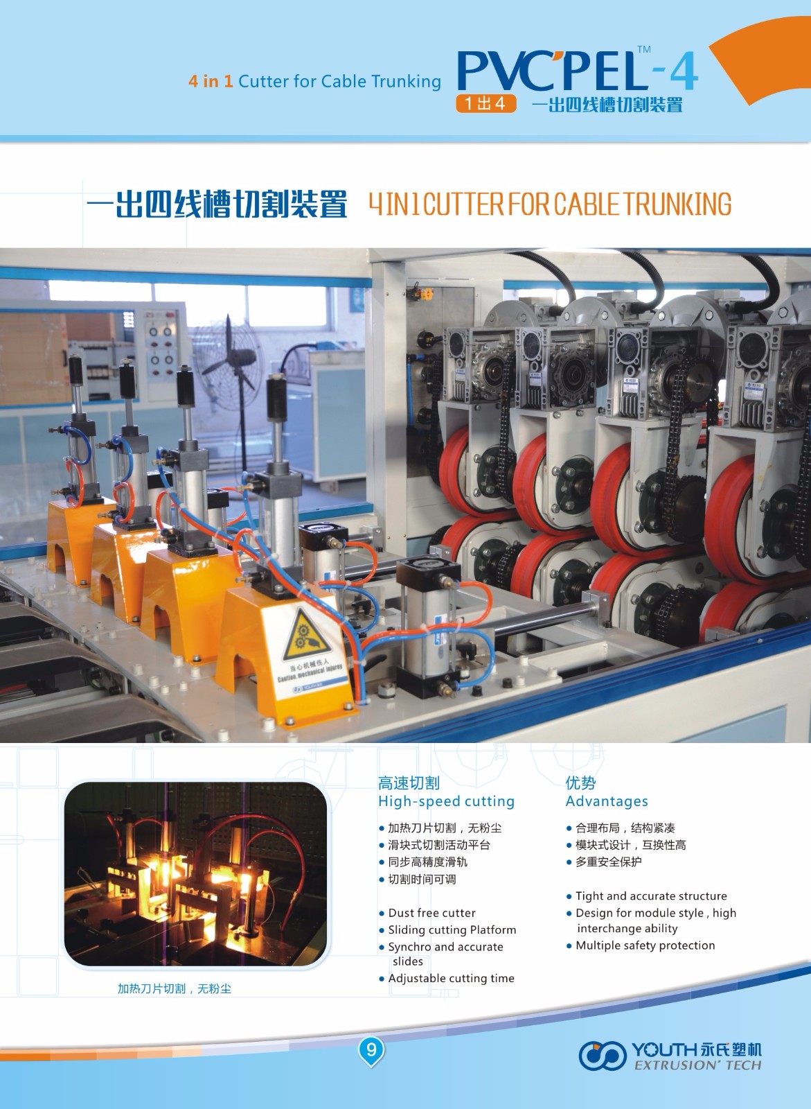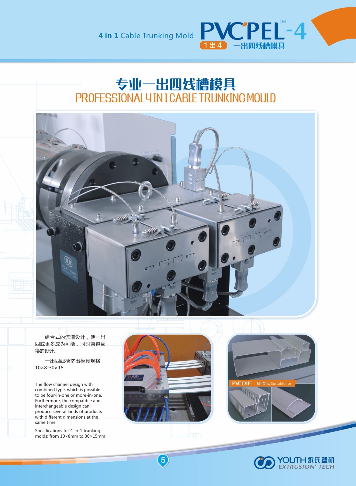 PVC cable trunking machine ( 4 in 1) is made of a 65/132 conical twin screw extruder, one set of 4 in 1 mould, one set of calibration table , haul-off & cutting combination (dust free) and stacker.The diameter of the best production tube is within 40*30mm.Main features: high capacity, low power consumption, low water gas consumption, low occupation, low noise, low dust, etc.